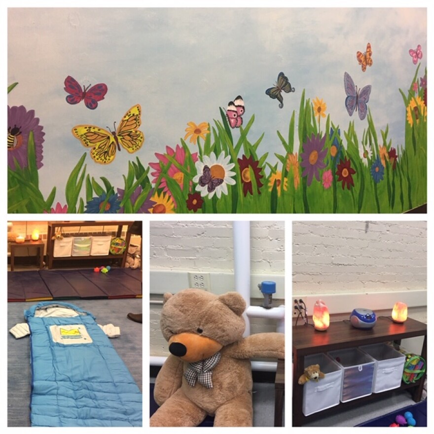 Soothing music, light blue walls, salt lamps and stuff animals make up this Calming Room at School 61. Amy Luraschi is a program coordinator at the school. She and other teachers painted the butterfly wall mural.