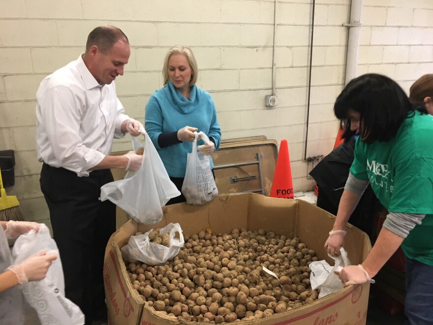 To help meet holiday demand, U.S. Senator Kirsten Gillibrand, State Senator Tim Kennedy and a half-dozen volunteers from M&T Bank took time on Friday to help sort donations.