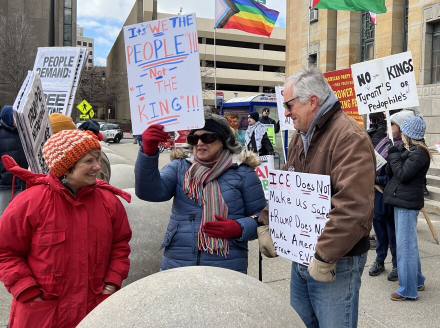 Even with a few peeks at the sun, it was cold at Saturday morning’s No Kings Rally in Buffalo’s Niagara Square. Still, hundreds chanted, held signs and marched in front of city hall as much in favor of democracy as against anything.
